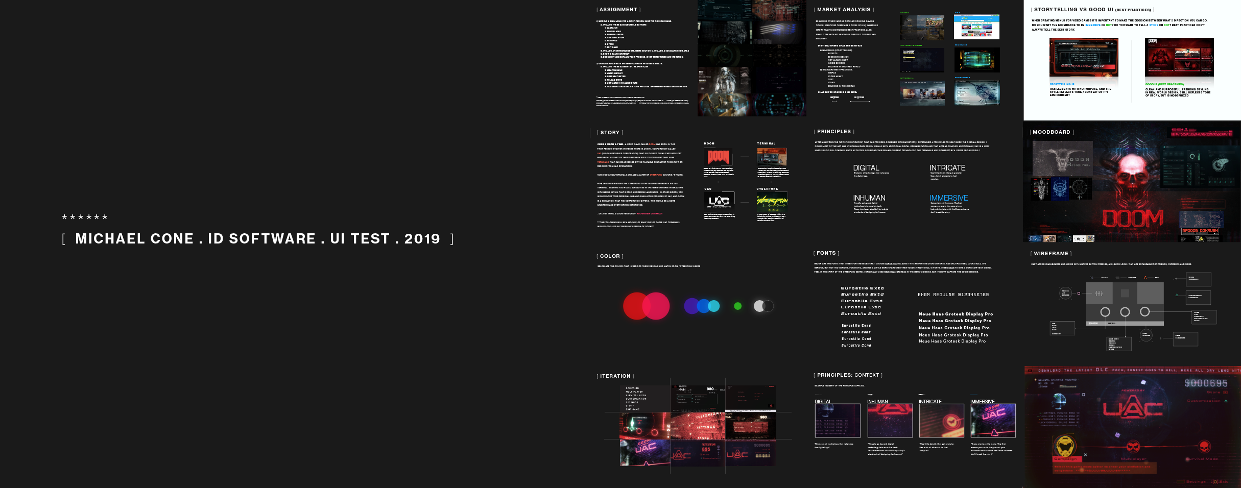 My assignment was to complete, within a short period of time, Id software’s challenge (mocking-up an FPS main menu, design/animate ammo-counter, create/present deck) and communicate how I think and what I can offer).